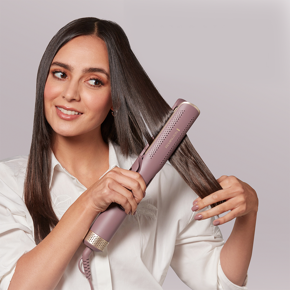 Estilizador de Aire 2 en 1 REMINGTON® AIRvive¿ seca y alisa el cabello sin calor extremo, ayudando a preservar la hidratación natural del cabello hasta por 24 horas. Estiliza el cabello seco con las placas de cerámica ultrasuaves que liberan microacondicionadores activados por calor para protegerlo contra frizz durante todo el día, mientras que el Aire Iónico ayuda a eliminar la estática y enfría el cabello al instante, logrando un resultado 80 % más suave.