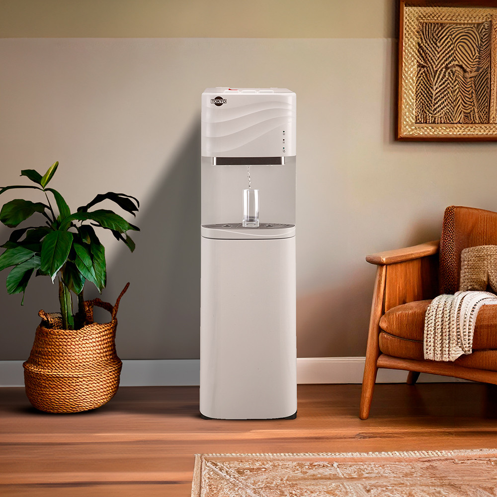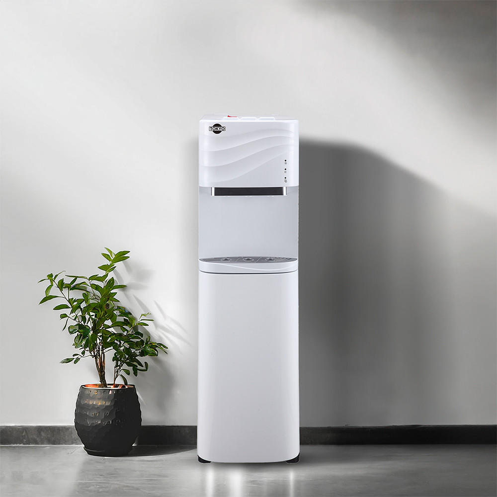 Este bebedero modelo TOKBE1634S cuenta con un depósito para bidón, dónde provee agua natural, caliente y fría.